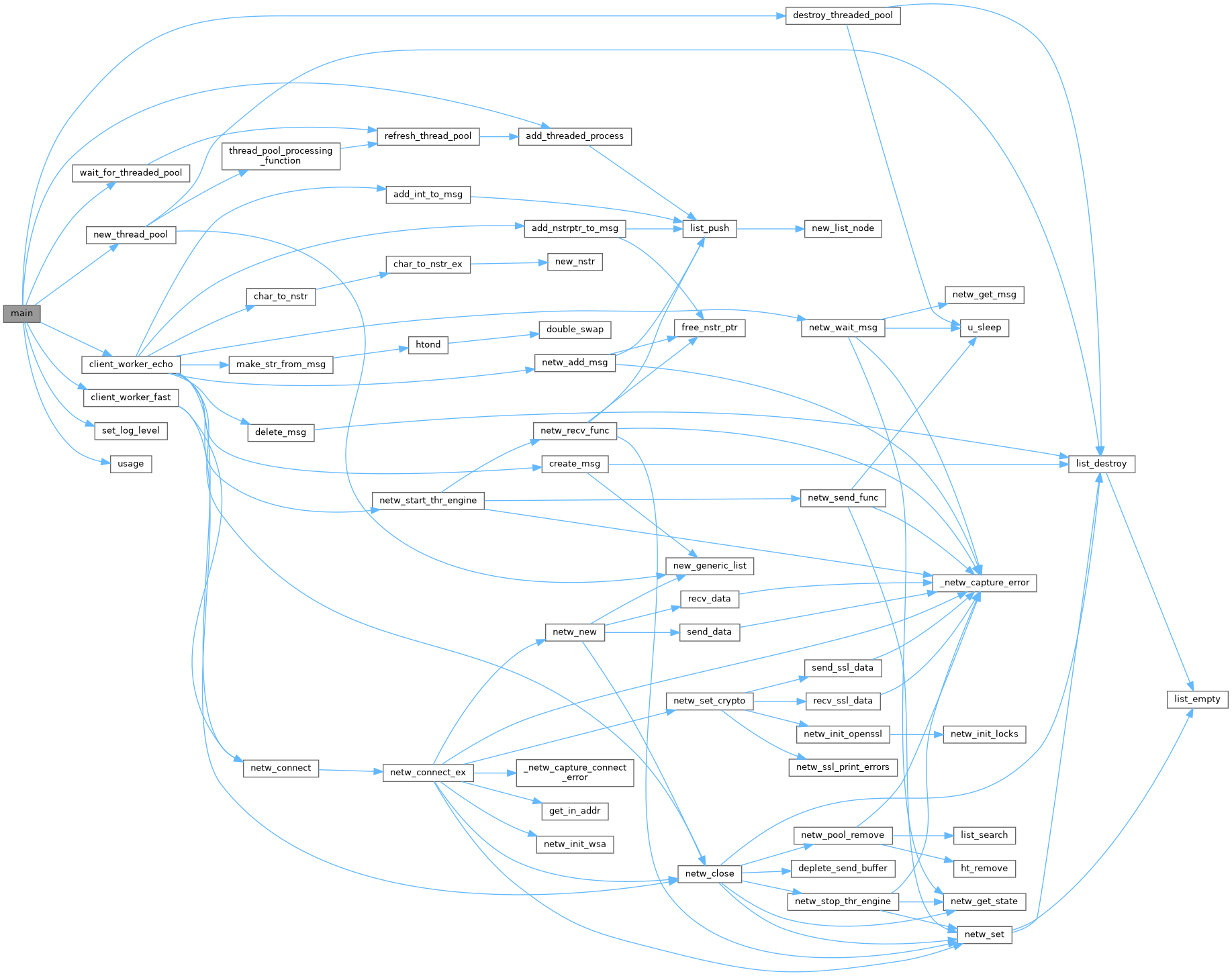References add_threaded_process(), client_echo_mode, client_worker_echo(), client_worker_fast(), destroy_threaded_pool(), CLIENT_STATE::fail_count, FreeNoLog, CLIENT_STATE::host, CLIENT_STATE::lock, LOG_DEBUG, LOG_ERR, LOG_INFO, log_level, LOG_NOTICE, n_log, new_thread_pool(), NORMAL_PROC, pool, CLIENT_STATE::port, port, set_log_level(), CLIENT_STATE::success_count, usage(), and wait_for_threaded_pool().