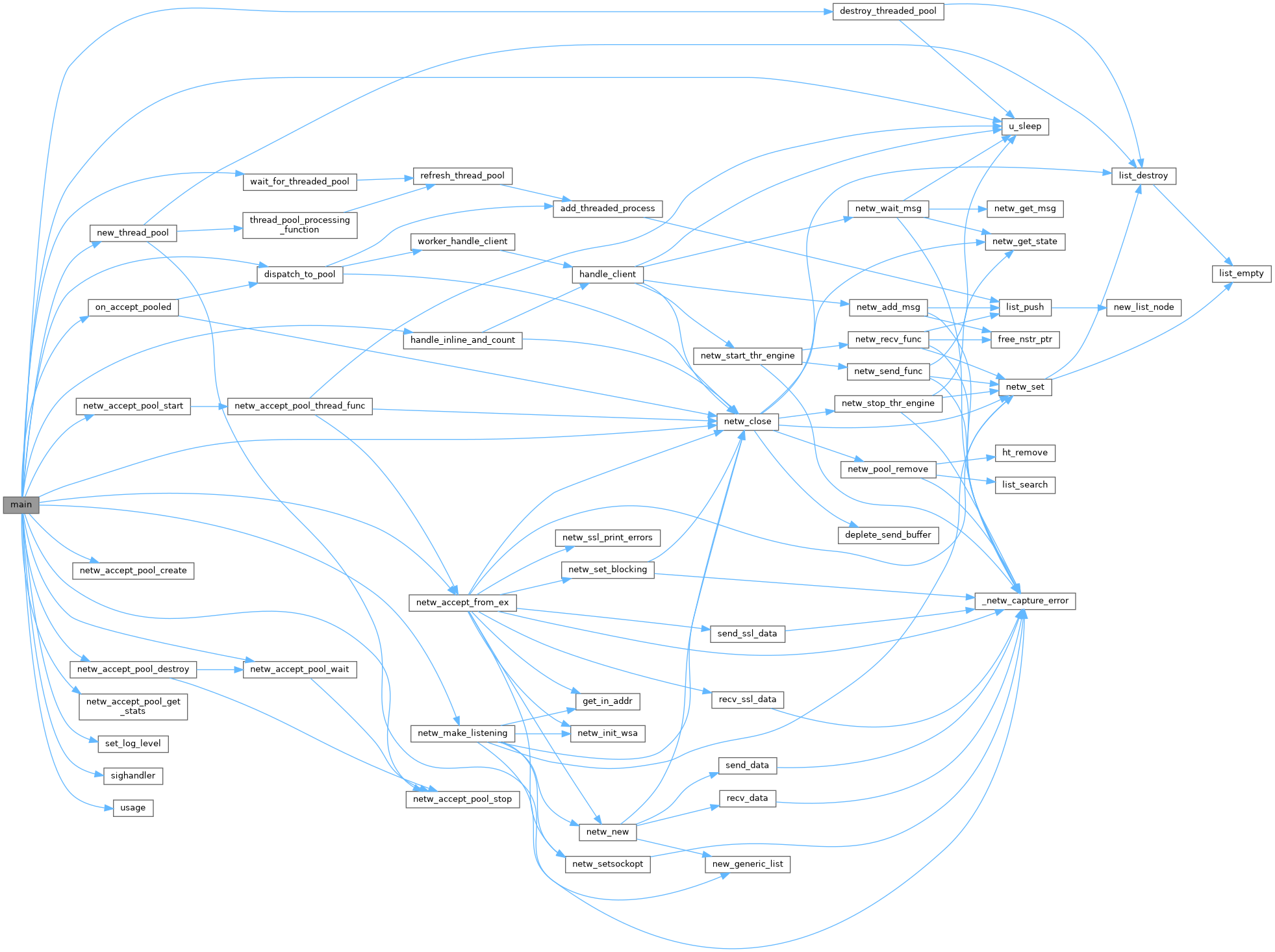 References NETW_ACCEPT_POOL_STATS::active_threads, addr, destroy_threaded_pool(), dispatch_to_pool(), FreeNoLog, handle_inline_and_count(), CALLBACK_DATA::handled, LOG_DEBUG, LOG_ERR, LOG_INFO, log_level, LOG_NOTICE, mode, MODE_POOLED, MODE_SINGLE_INLINE, MODE_SINGLE_POOL, n_log, netw_accept_from_ex(), netw_accept_pool_create(), netw_accept_pool_destroy(), netw_accept_pool_get_stats(), netw_accept_pool_start(), netw_accept_pool_stop(), netw_accept_pool_wait(), netw_close(), netw_make_listening(), NETWORK_IPALL, new_thread_pool(), on_accept_pooled(), port, server, server_running, set_log_level(), sighandler(), NETW_ACCEPT_POOL_STATS::total_accepted, NETW_ACCEPT_POOL_STATS::total_errors, total_target, NETW_ACCEPT_POOL_STATS::total_timeouts, u_sleep(), usage(), and wait_for_threaded_pool().
