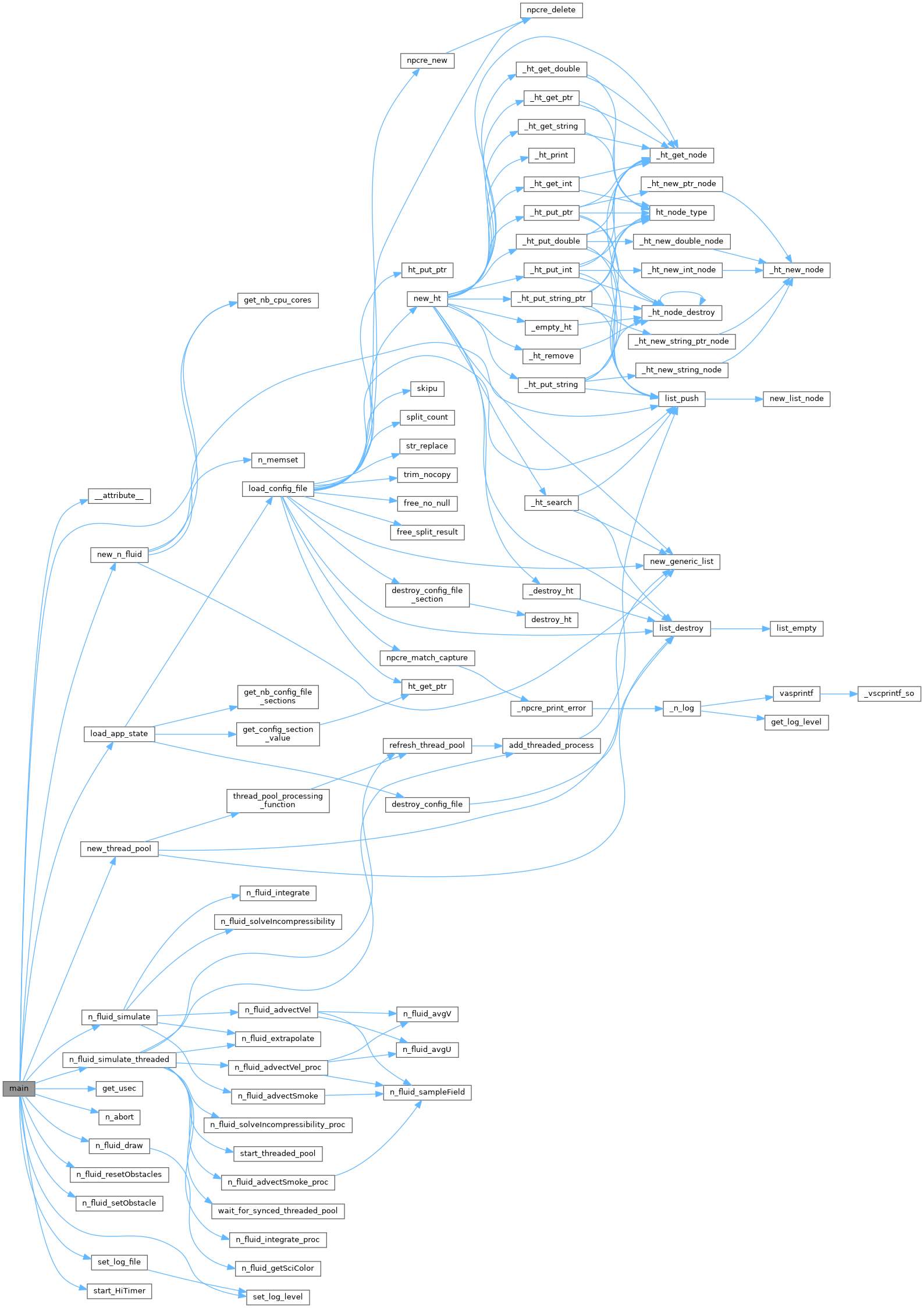 References __attribute__(), _nstr, _str, bgmusic, N_FLUID::cScale, N_FLUID::density, display, DONE, drawFPS, drawing_chrono, N_FLUID::dt, N_FLUID::fluid_production_percentage, fluid_sim, fps_timer, Free, free_nstr, fullscreen, get_nb_cpu_cores(), get_usec(), getoptret, N_FLUID::gravity, HEIGHT, key, load_app_state(), LOG_DEBUG, LOG_ERR, log_file, LOG_INFO, log_level, LOG_NOTICE, logic_chrono, logic_timer, logicFPS, N_FLUID::m, Malloc, MAX_SAMPLE_DATA, n_abort(), n_fluid_draw(), n_fluid_resetObstacles(), n_fluid_setObstacle(), n_fluid_simulate(), n_fluid_simulate_threaded(), n_log, new_n_fluid(), new_thread_pool(), nstrprintf, N_FLUID::numIters, N_FLUID::numX, N_FLUID::numY, N_FLUID::overRelaxation, RESERVED_SAMPLES, N_FLUID::s, set_log_file(), set_log_level(), N_FLUID::showPaint, N_FLUID::showPressure, N_FLUID::showSmoke, start_HiTimer(), thread_pool, N_FLUID::u, and WIDTH.