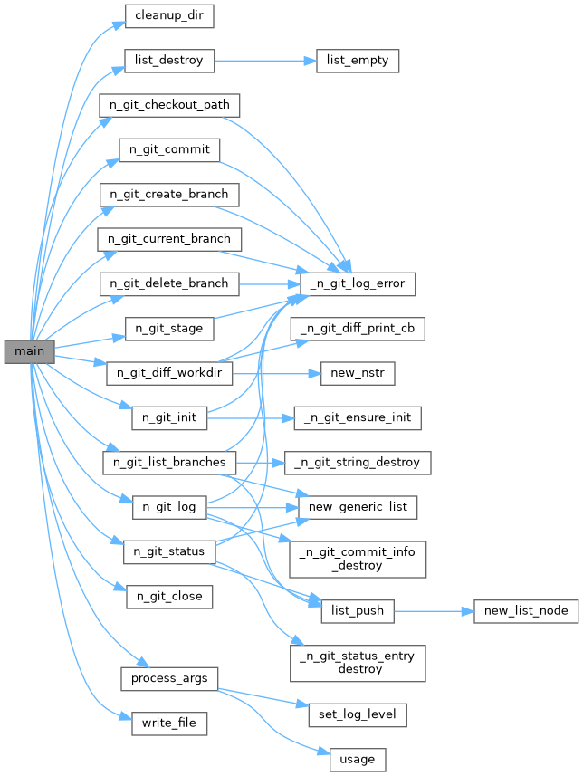 References N_GIT_COMMIT_INFO::author, cleanup_dir(), N_STR::data, done, free_nstr, N_GIT_COMMIT_INFO::hash, list_destroy(), LOG_DEBUG, LOG_ERR, LOG_INFO, N_GIT_COMMIT_INFO::message, n_git_checkout_path(), n_git_close(), n_git_commit(), n_git_create_branch(), n_git_current_branch(), n_git_delete_branch(), n_git_diff_workdir(), n_git_init(), n_git_list_branches(), n_git_log(), n_git_stage(), n_git_status(), n_log, LIST::nb_items, process_args(), LIST_NODE::ptr, N_GIT_COMMIT_INFO::short_hash, LIST::start, write_file(), and N_STR::written.