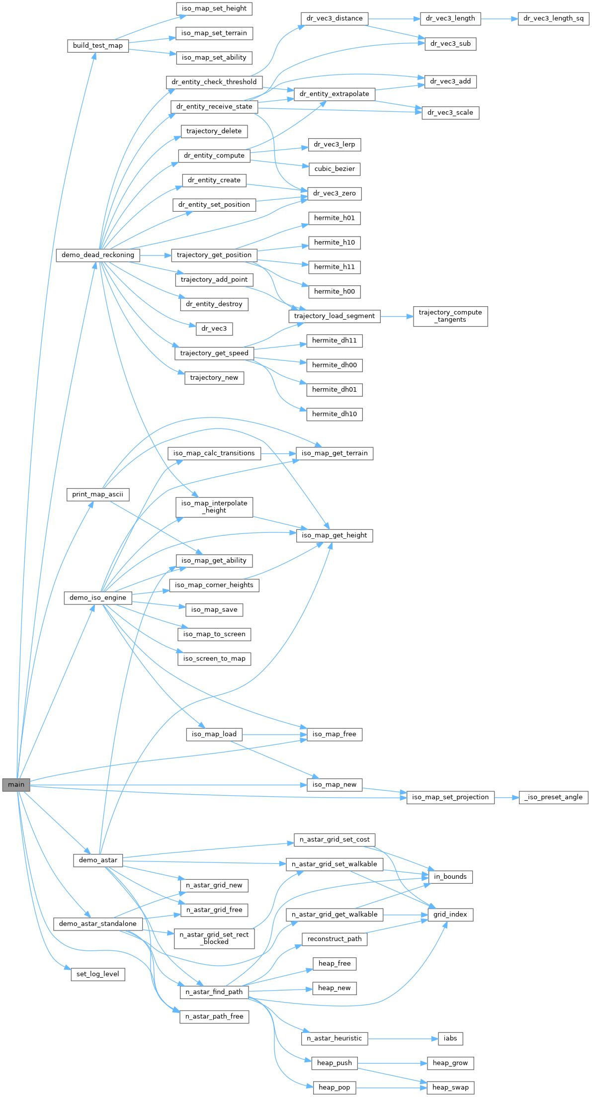 References build_test_map(), demo_astar(), demo_astar_standalone(), demo_dead_reckoning(), demo_iso_engine(), iso_map_free(), iso_map_new(), iso_map_set_projection(), ISO_PROJ_CLASSIC, LOG_NOTICE, MAP_H, MAP_W, MAX_HEIGHT, n_astar_path_free(), NUM_TERRAINS, print_map_ascii(), set_log_level(), and TILE_WIDTH.