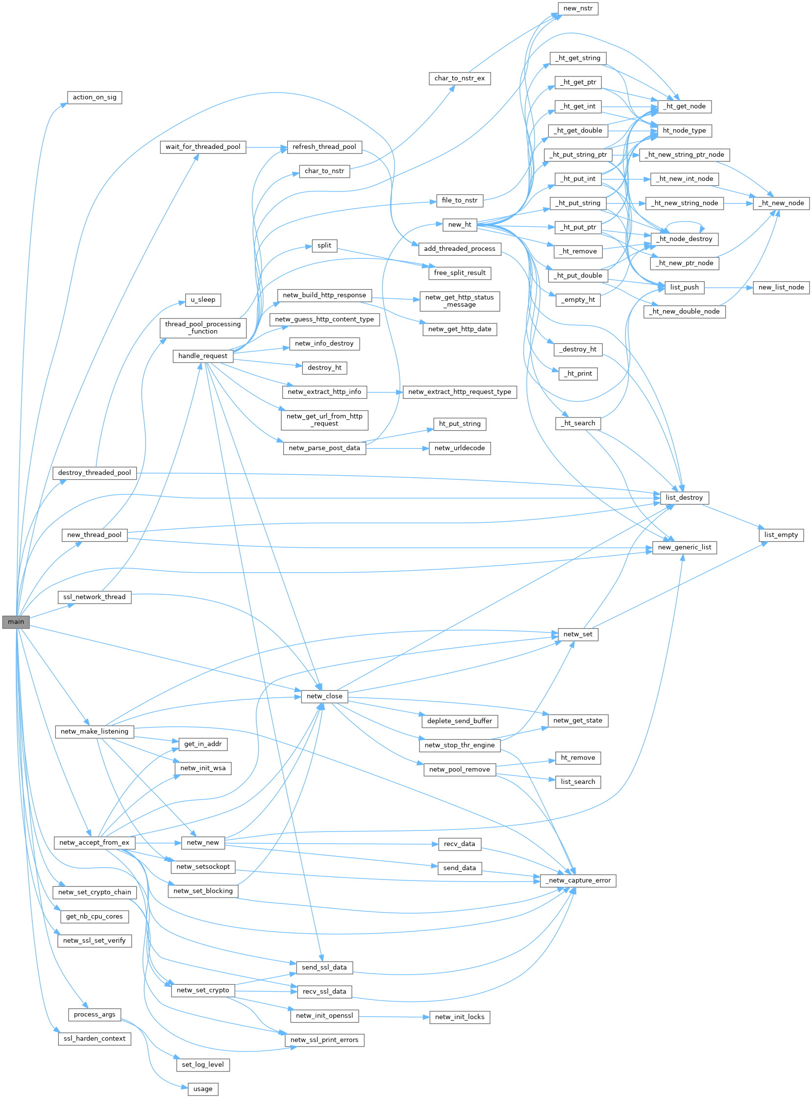 References __n_assert, _str, action_on_sig(), add_threaded_process(), addr, ca_file, cert, destroy_threaded_pool(), DIRECT_PROC, done, FreeNoLog, get_nb_cpu_cores(), ip_version, key, NETWORK::link, list_destroy(), LOG_DEBUG, LOG_ERR, LOG_INFO, LOG_NOTICE, Malloc, max_connections, max_http_request_size, MAX_LIST_ITEMS, n_log, netw, NETWORK_SSL_THREAD_PARAMS::netw, netw_accept_from_ex(), netw_close(), netw_make_listening(), netw_set_crypto(), netw_set_crypto_chain(), netw_ssl_set_verify(), new_generic_list(), new_thread_pool(), port, process_args(), root_dir, routes, NETWORK_SSL_THREAD_PARAMS::routes, server, N_SOCKET::sock, ssl_harden_context(), ssl_network_thread(), ssl_verify, thread_pool, and wait_for_threaded_pool().