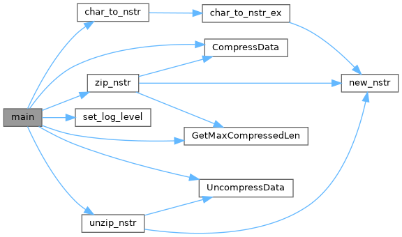 References __n_assert, char_to_nstr(), CompressData(), N_STR::data, Free, free_nstr, GetMaxCompressedLen(), N_STR::length, LOG_DEBUG, LOG_ERR, LOG_INFO, LOG_NOTICE, Malloc, n_log, set_log_level(), UncompressData(), unzip_nstr(), N_STR::written, and zip_nstr().