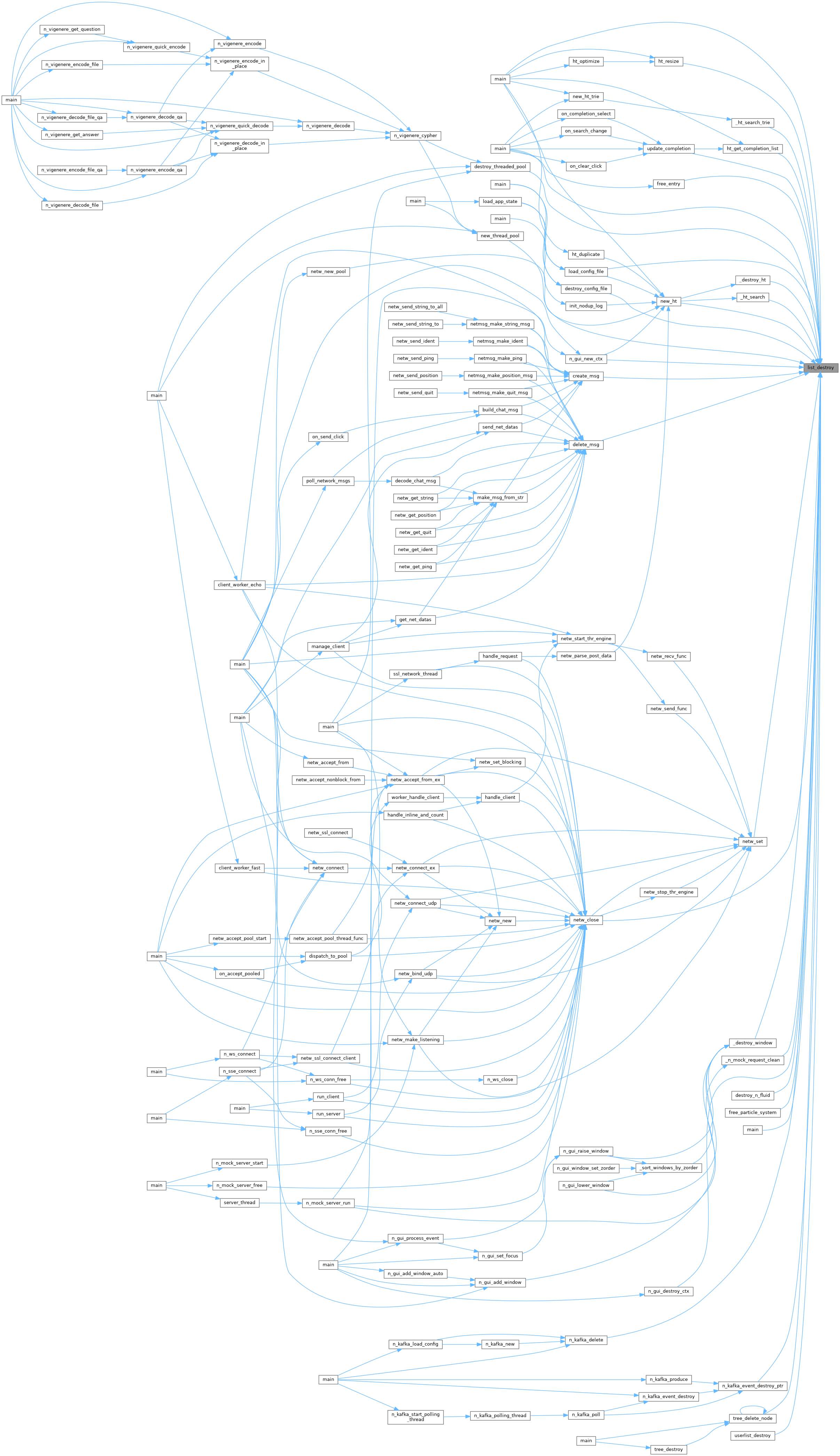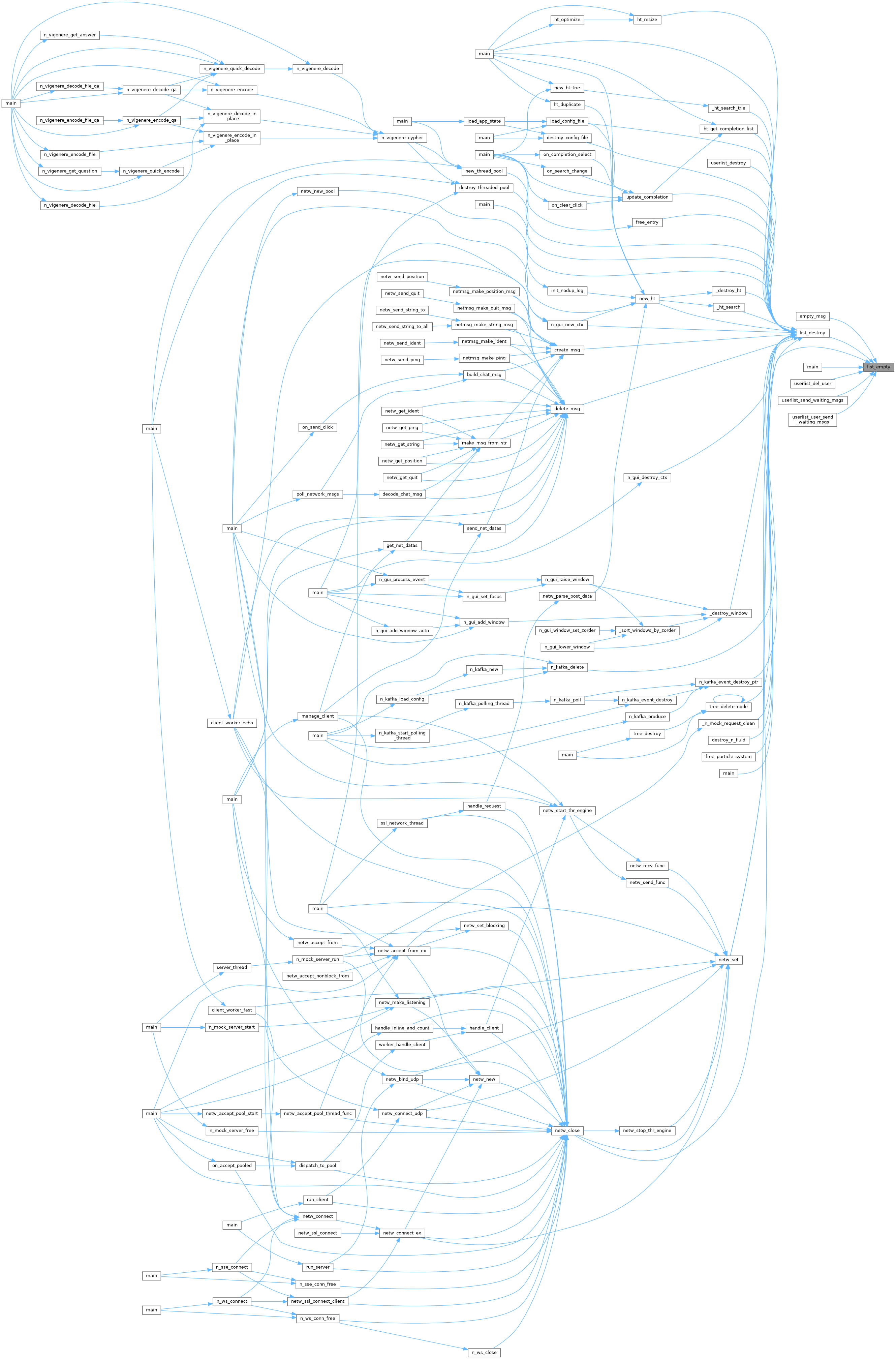 Referenced by _destroy_ht(), _destroy_window(), _ht_search(), _ht_search_trie(), _n_mock_request_clean(), create_msg(), delete_msg(), destroy_config_file(), destroy_n_fluid(), destroy_threaded_pool(), free_entry(), free_particle_system(), ht_get_completion_list(), ht_resize(), load_config_file(), main(), main(), main(), n_gui_destroy_ctx(), n_gui_new_ctx(), n_kafka_delete(), n_kafka_event_destroy_ptr(), netw_close(), netw_set(), new_ht(), new_thread_pool(), tree_delete_node(), update_completion(), and userlist_destroy().